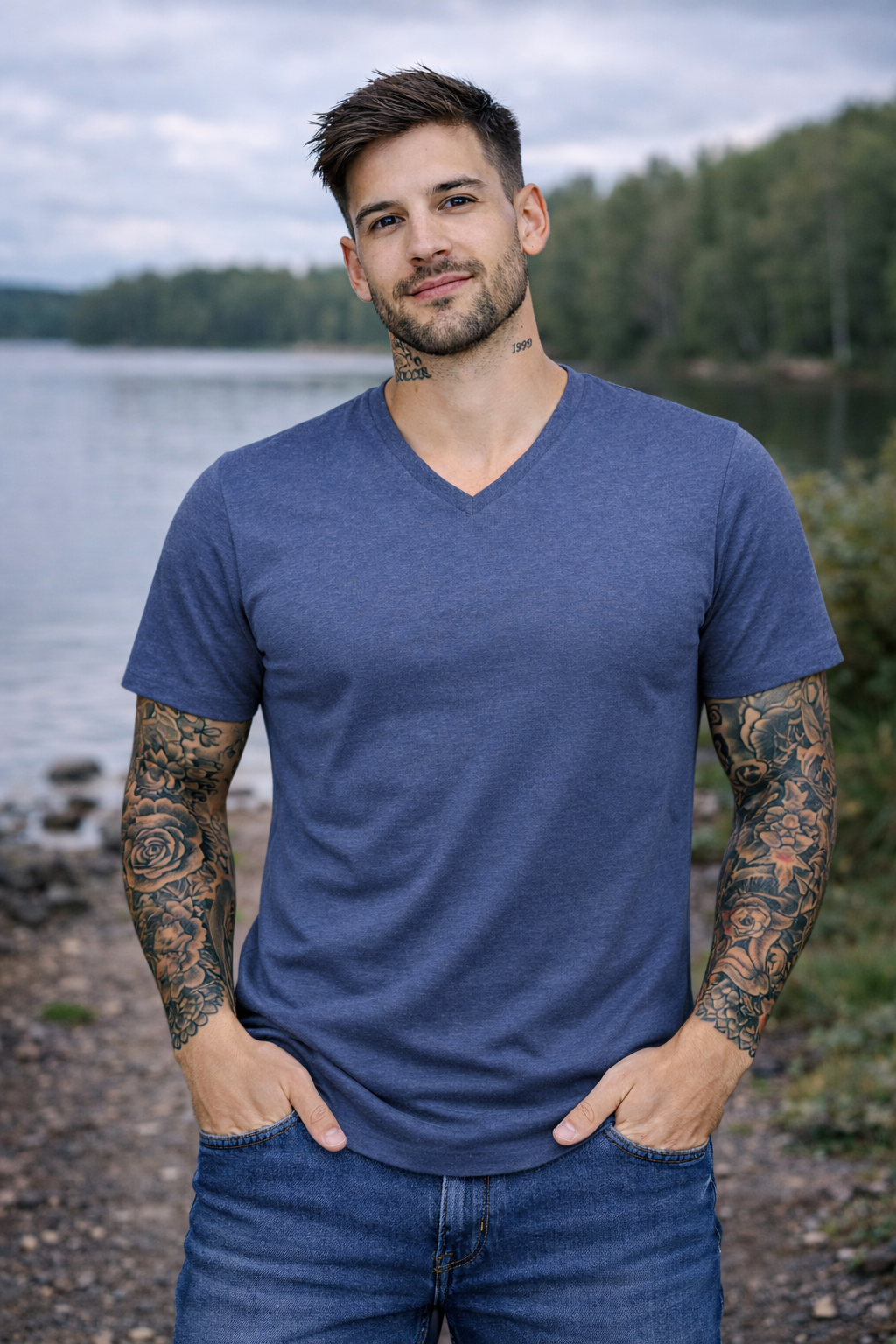 Fitted T-shirt i casual design. Perfekt udskåret V-hals T-shirt med smal rib i hals og ærmer samt cool stikningsdetaljer ved ærmegab og i bunden.