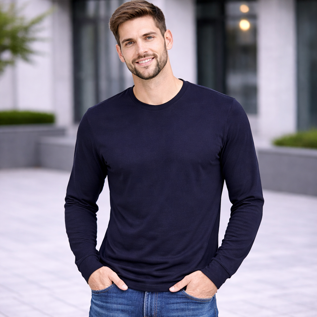 Langærmet interlock T-shirt i blød antipillingkvalitet. Rund hals og smal halsrib. Tætsiddende model.