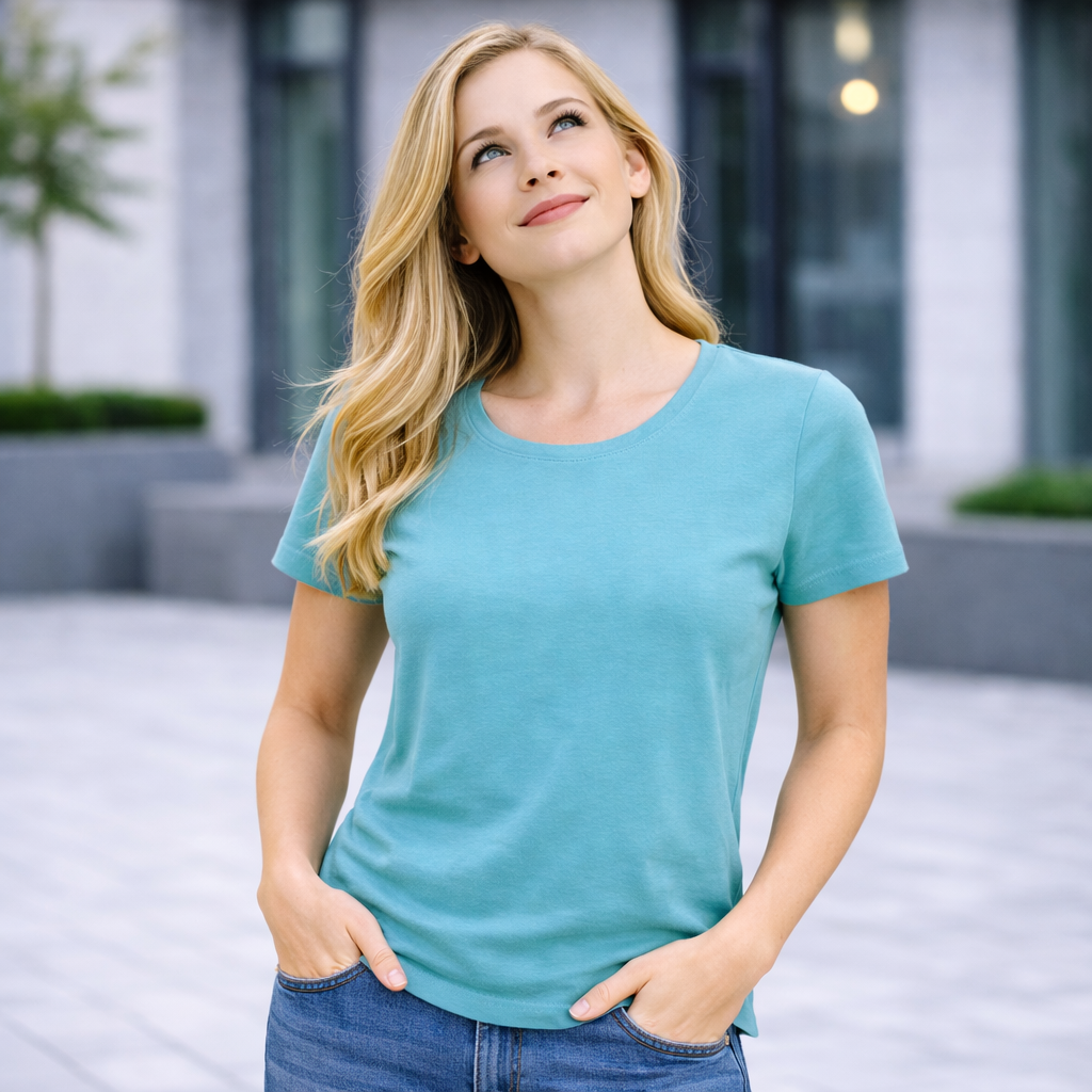 Kortærmet T-shirt i behagelig bomuldskvalitet med stretch for bedste komfort og pasform. Med feminin rund hals og smal halsrib. Tætsiddende model.